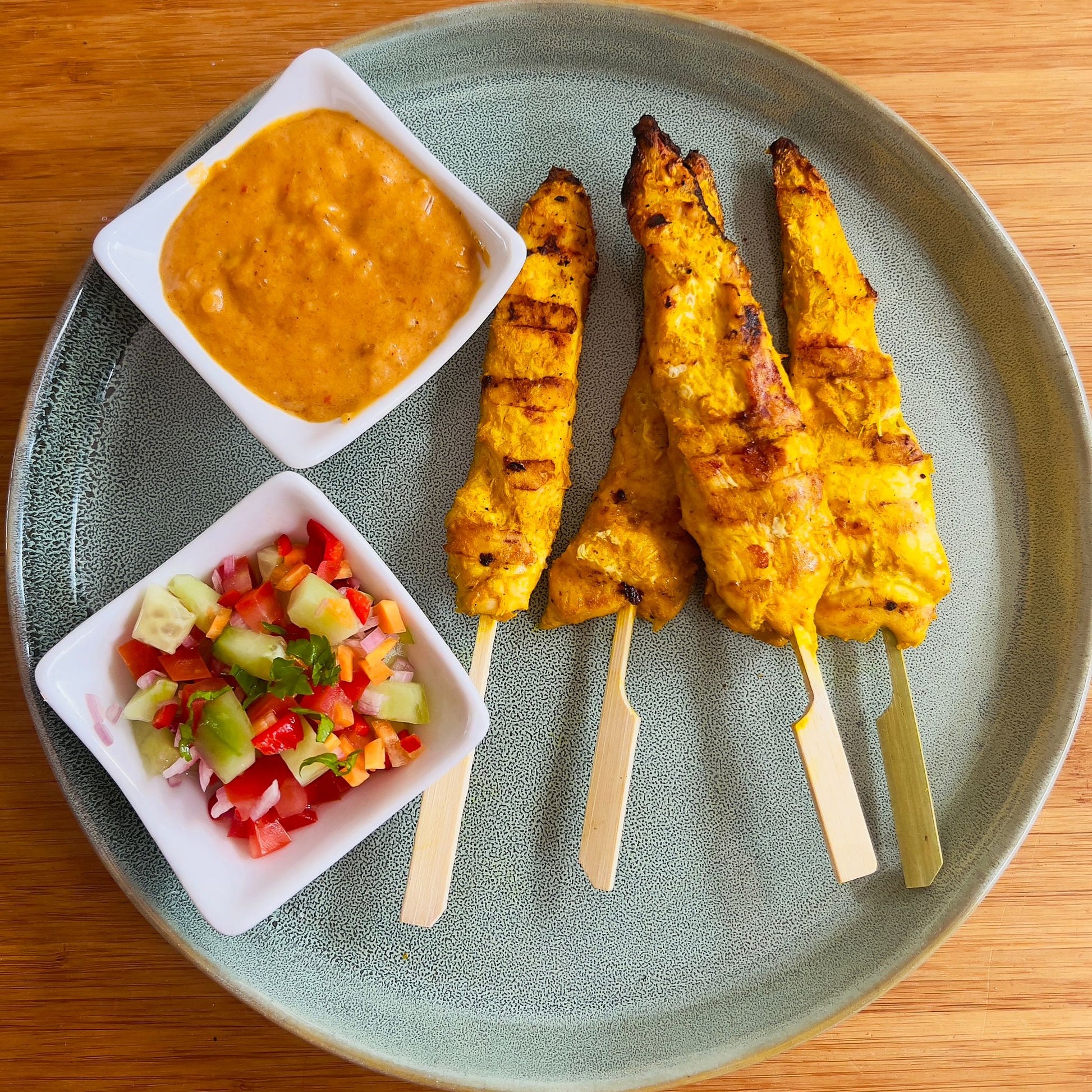 Kipsaté met pindasaus en garnituur van groenten